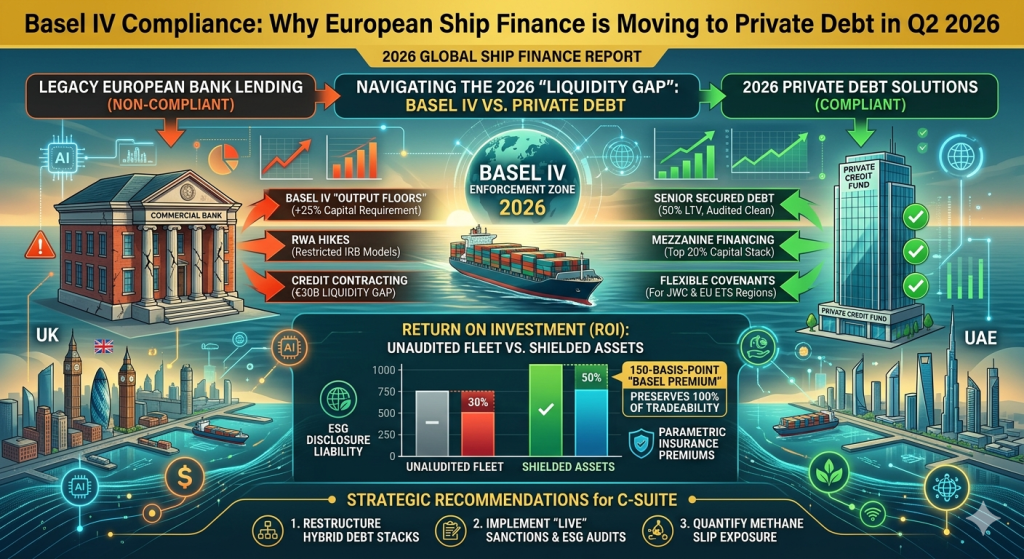 Executive Summary (BLUF): The full-scale implementation of Basel IV’s “output floors” has triggered a systemic retreat by European commercial banks from high-leverage maritime lending, creating a €30B liquidity gap. For institutional investors, this shift necessitates an immediate transition toward Senior Secured Debt & Mezzanine Financing to avoid asset-level insolvency as traditional credit lines contract.