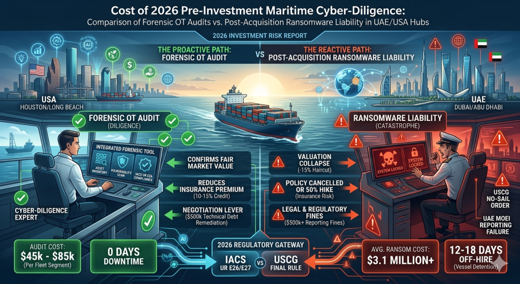 When an audit identifies $500,000 in required cyber-upgrades (Technical Debt), the investor gains a powerful negotiating lever. Investor Strategy Note: “In 2026, if our forensic audit reveals that a 5-vessel fleet requires $1M in IACS E26 retrofitting, we immediately deduct that $1M from the purchase price. The audit doesn’t just protect us; it pays for itself 10x over at the closing table.”