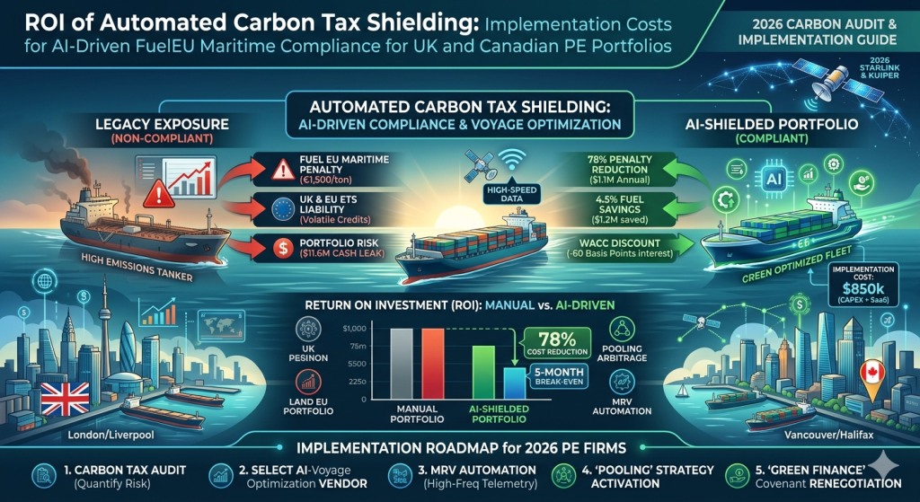 For UK and Canadian PE portfolios, where vessels frequently transit European Economic Area (EEA) waters, “Carbon Tax Shielding” has become a mandatory financial strategy. This 2026 Audit examines the implementation of AI-Driven Compliance Systems designed to automate the monitoring, reporting, and verification (MRV) process while actively optimizing voyages to minimize tax exposure.